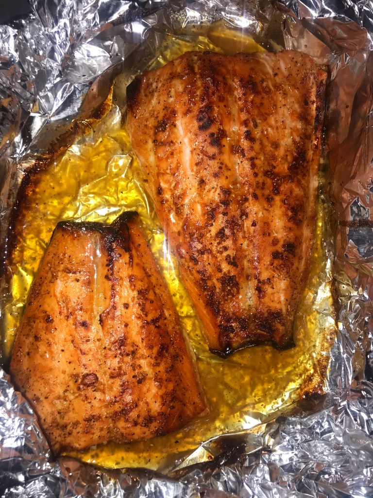 - Place salmon on the foil and brush mixture evenly over salmon. Sprinkle with a good amount of salt and pepper.