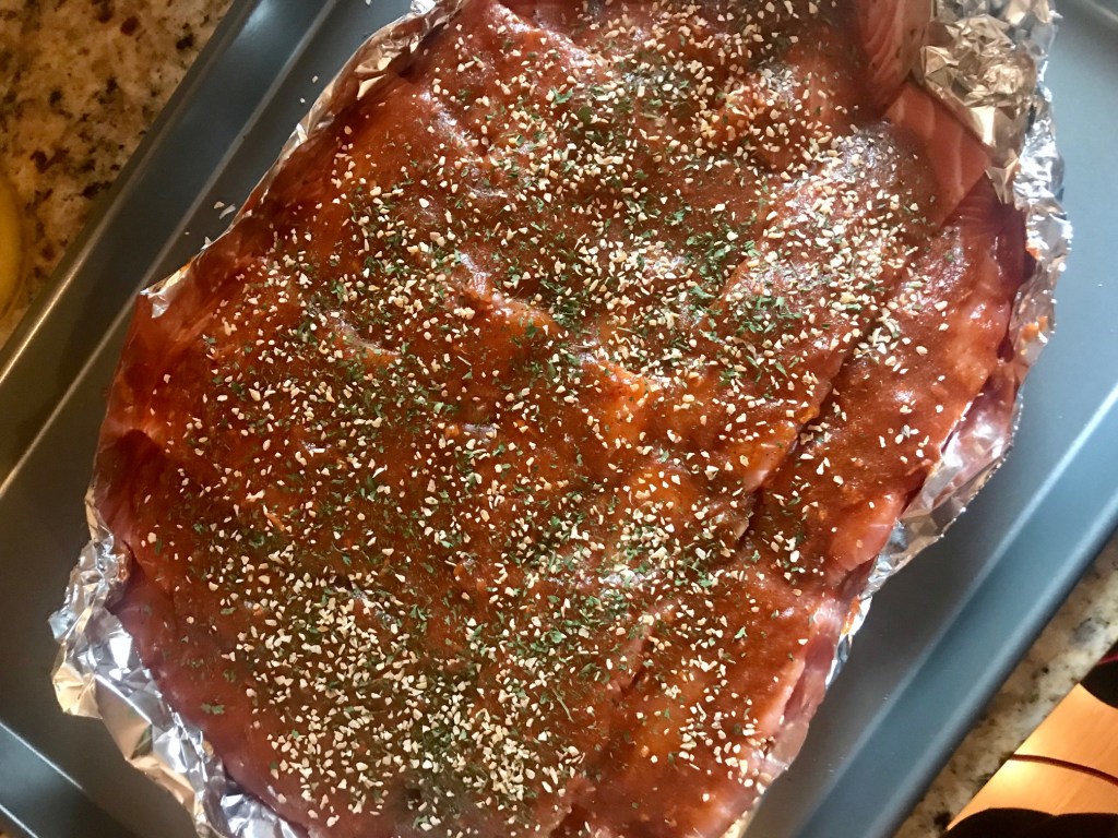 - First start by cutting your salmon into strips and placing them on a tinfoil lined cooking pan.